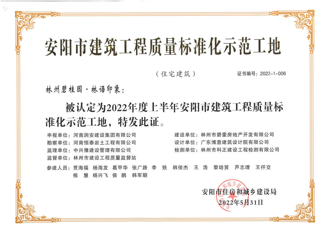 近期,集團公司承建的多個項目捷報頻傳,先后有“林州碧桂園?林語印象項目”,被評為2022年上半年安陽市建筑工程質(zhì)量標準化示范工地;潤安楓林臺1-3、5-9號樓、林州碧桂園?天璽7號樓榮獲2022年度安陽市殷都杯工程獎。同時,吾悅鴻城質(zhì)量管理小組、云頂質(zhì)量管理小組、璽悅質(zhì)量管理小組申報的三項課題均被河南省建筑業(yè)協(xié)會評為一等成果。